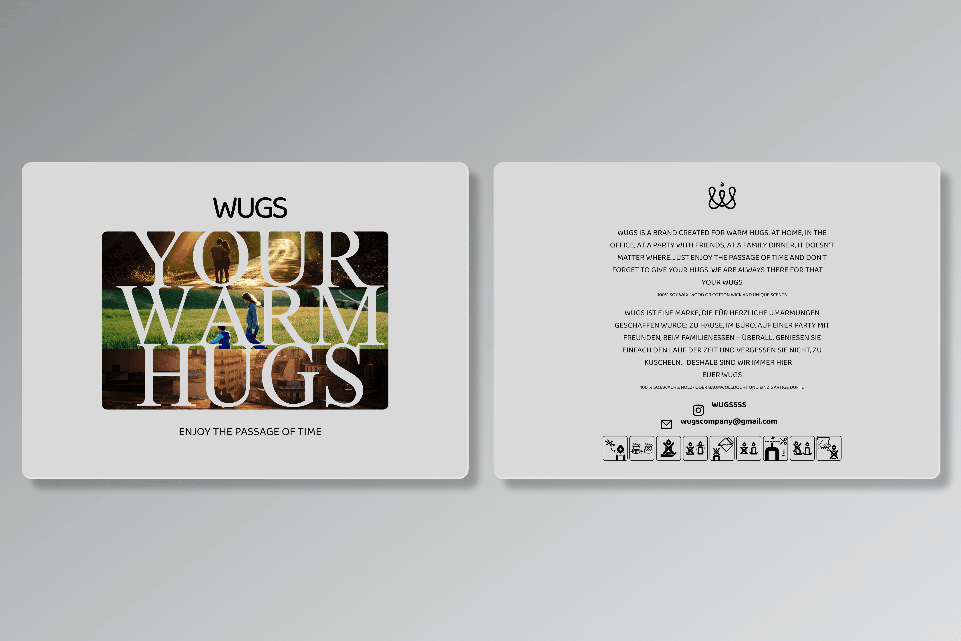 For the candle brand WUGS, which stands for Your Warm Hugs, I created the logo and complete branding. This collection of handcrafted aromatic candles is designed to evoke a sense of warmth, comfort, and homely harmony.