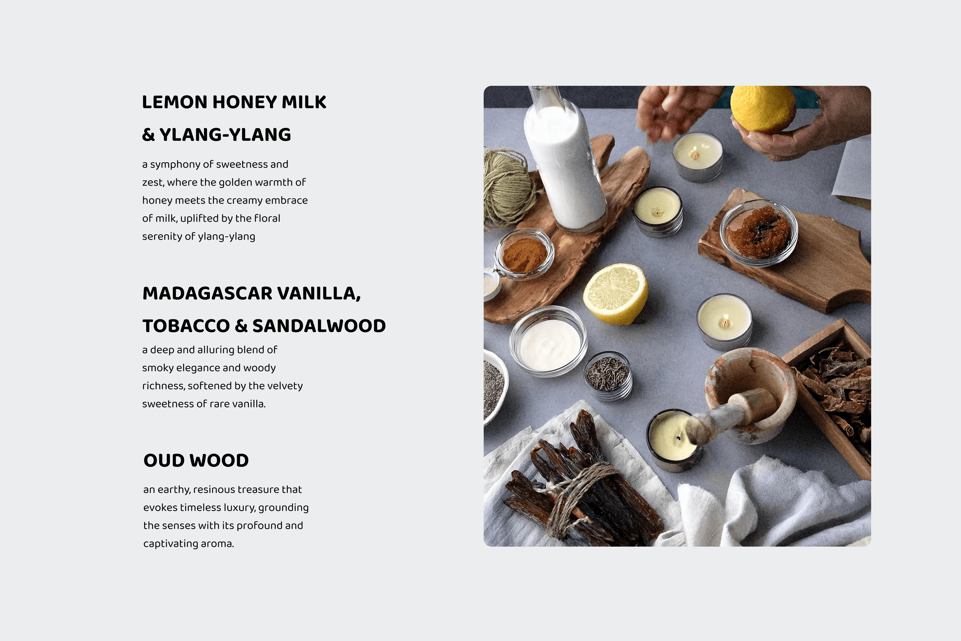 The brand’s visual system emphasizes warmth and intimacy, reflecting the unique, handcrafted nature of the candles. The design is clean, elegant, and approachable, perfectly communicating the personality and charm of the product.